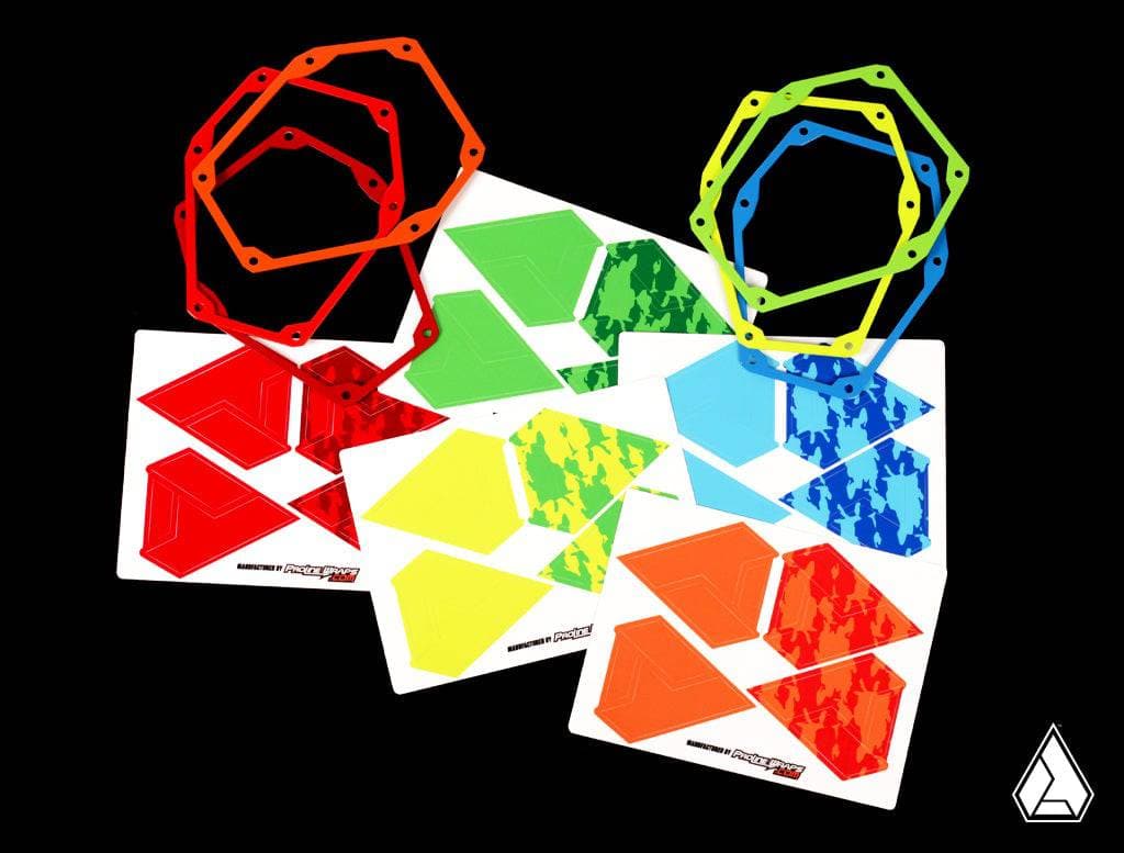 The Assault Industries Aviator Mirror dress up kit features a custom powder coated aluminum mirror-glass bezel and an Assault logo decal pack!